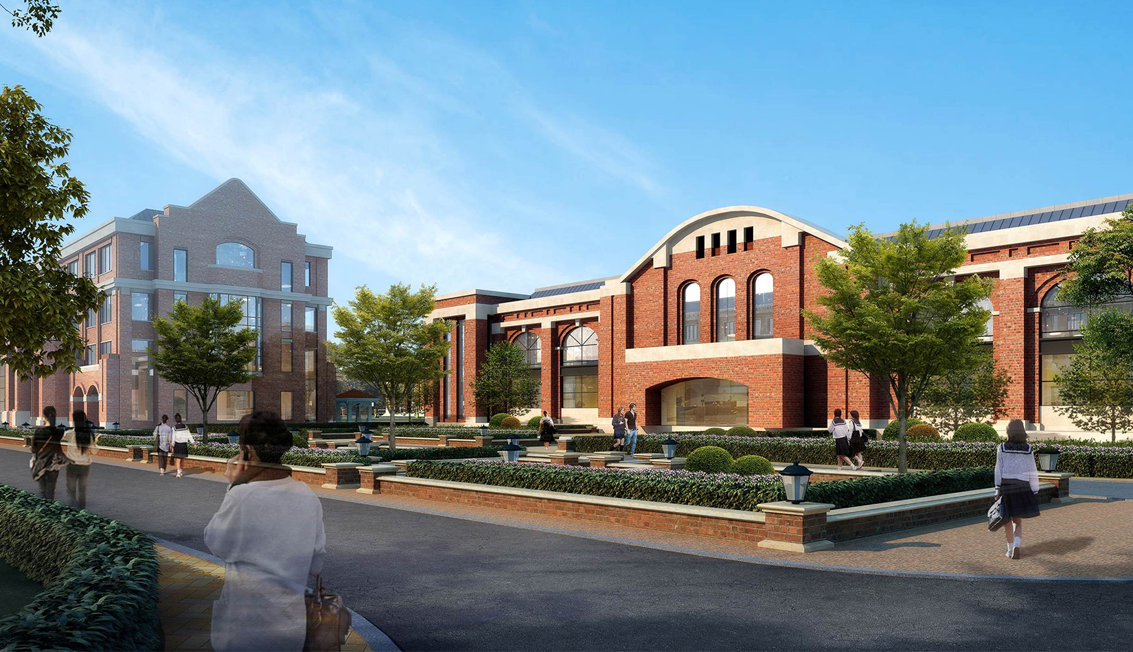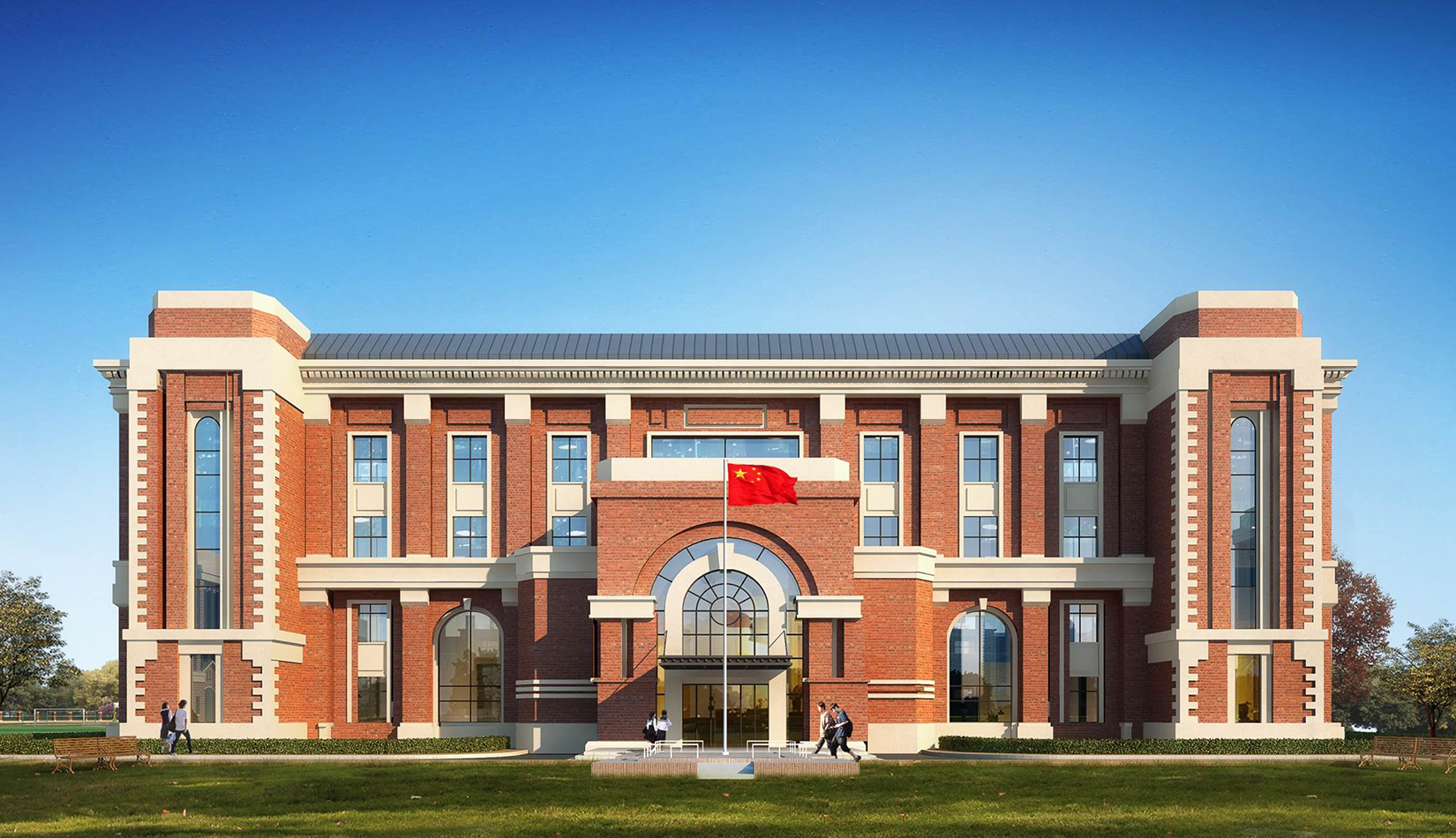 分區(qū)設(shè)計(jì)上,采用了“前場(chǎng)后園”的設(shè)計(jì)手法。前區(qū)以教學(xué)區(qū)為主,圍繞中心圖書綜合樓形成前區(qū)禮儀性廣場(chǎng),同時(shí)以中軸對(duì)稱為原則,體現(xiàn)了教學(xué)的嚴(yán)肅性與秩序性;各個(gè)教學(xué)單元以年級(jí)、功能就近布置為基本原則,以中國傳統(tǒng)的“院落”形式進(jìn)行組合,后院生活區(qū)借鑒了“山水園林”的布局手法,結(jié)合中心景觀,進(jìn)行自由化布局,達(dá)到景入園中、人在景中生活場(chǎng)景,使學(xué)生在學(xué)習(xí)之余,得到充分的放松。