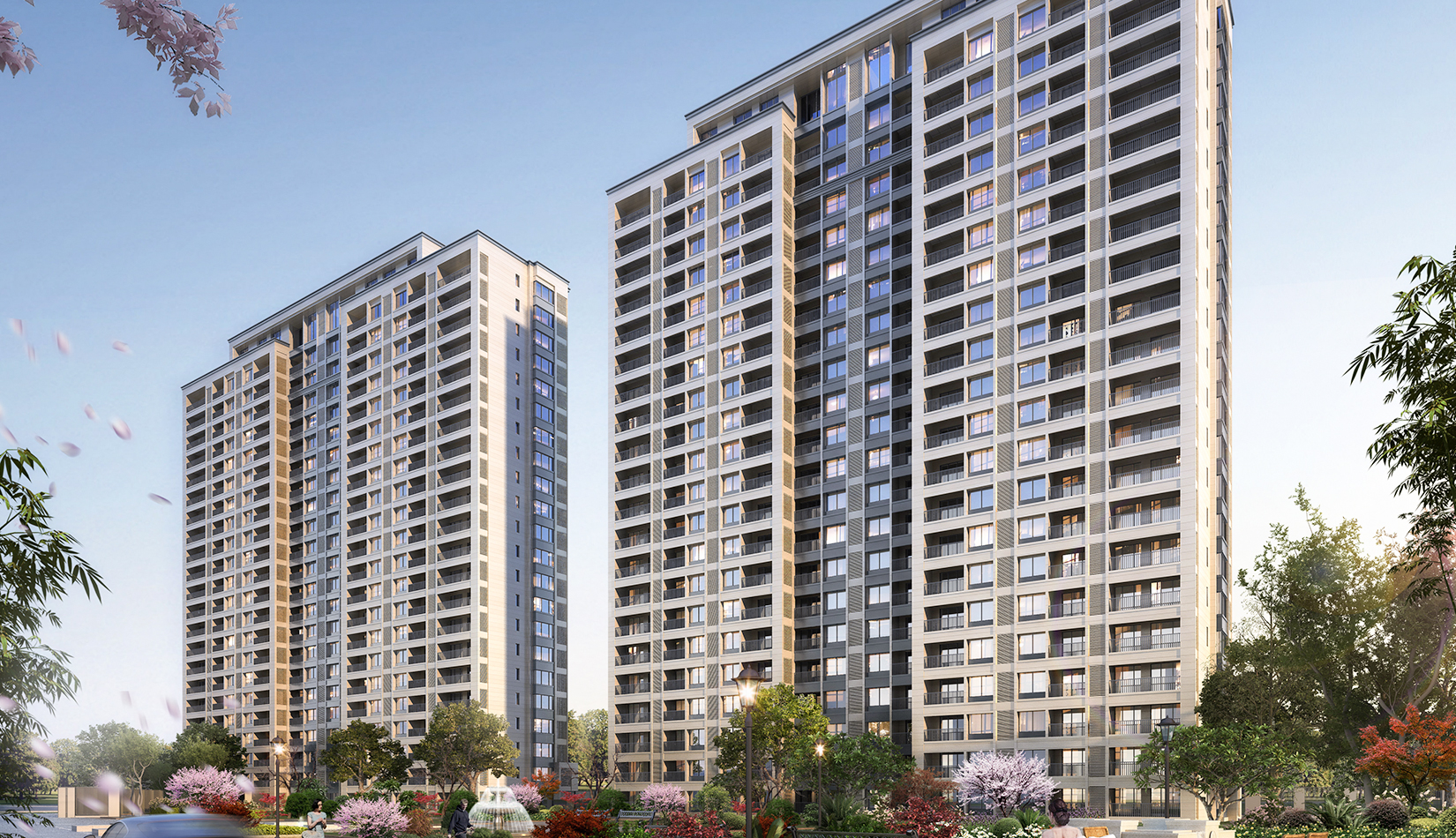立面打造可識別性的“社區(qū)”建筑語匯,在周邊版塊中做到脫穎而出。建筑風格莊重精美,通過運用傳統(tǒng)美學法則來使現(xiàn)代的材料與結(jié)構(gòu)產(chǎn)生規(guī)整、端莊、典雅的安定感。商業(yè)立面通過將具有力量感的矩形石材墻面和玻璃幕墻進行體塊穿插與虛實結(jié)合。勾勒出與住宅風格一致的現(xiàn)代,簡約,富有商業(yè)氣息的造型。同時,創(chuàng)造出豐富的露臺空間與立面層次,完美的樹立了本項目的沿街形象。