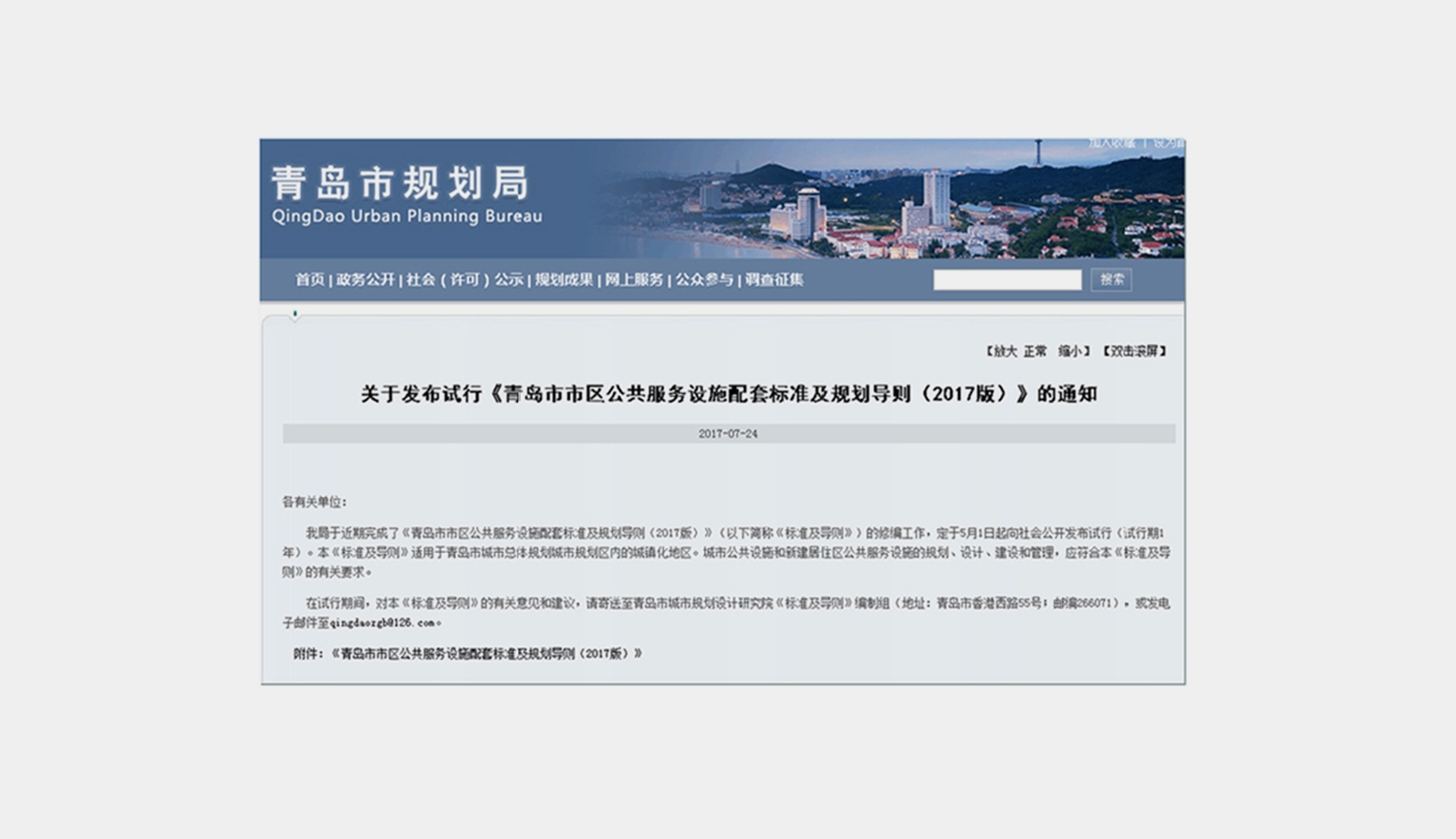 2017 年5 月1 日起向社會公開發(fā)布試行,成為青島市中心城區(qū)81片控制性詳細規(guī)劃、修建性詳細規(guī)劃公共服務(wù)設(shè)施規(guī)劃的依據(jù)。