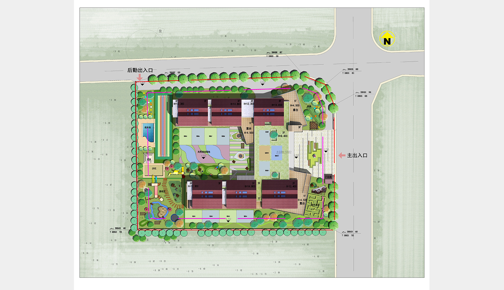 建筑造型來源于兒童最初對房子的印象并進行延伸,加上積木搭接形態(tài),形成C字形圍合的主體建筑,就像父母溫暖的懷抱;建筑造型跟兒童產生很好的親切感,讓兒童將上幼兒園成為快樂的事情。同時形態(tài)結合地緣文化特色,采用雙折坡屋頂,寓意展翅翱翔的海鷗。