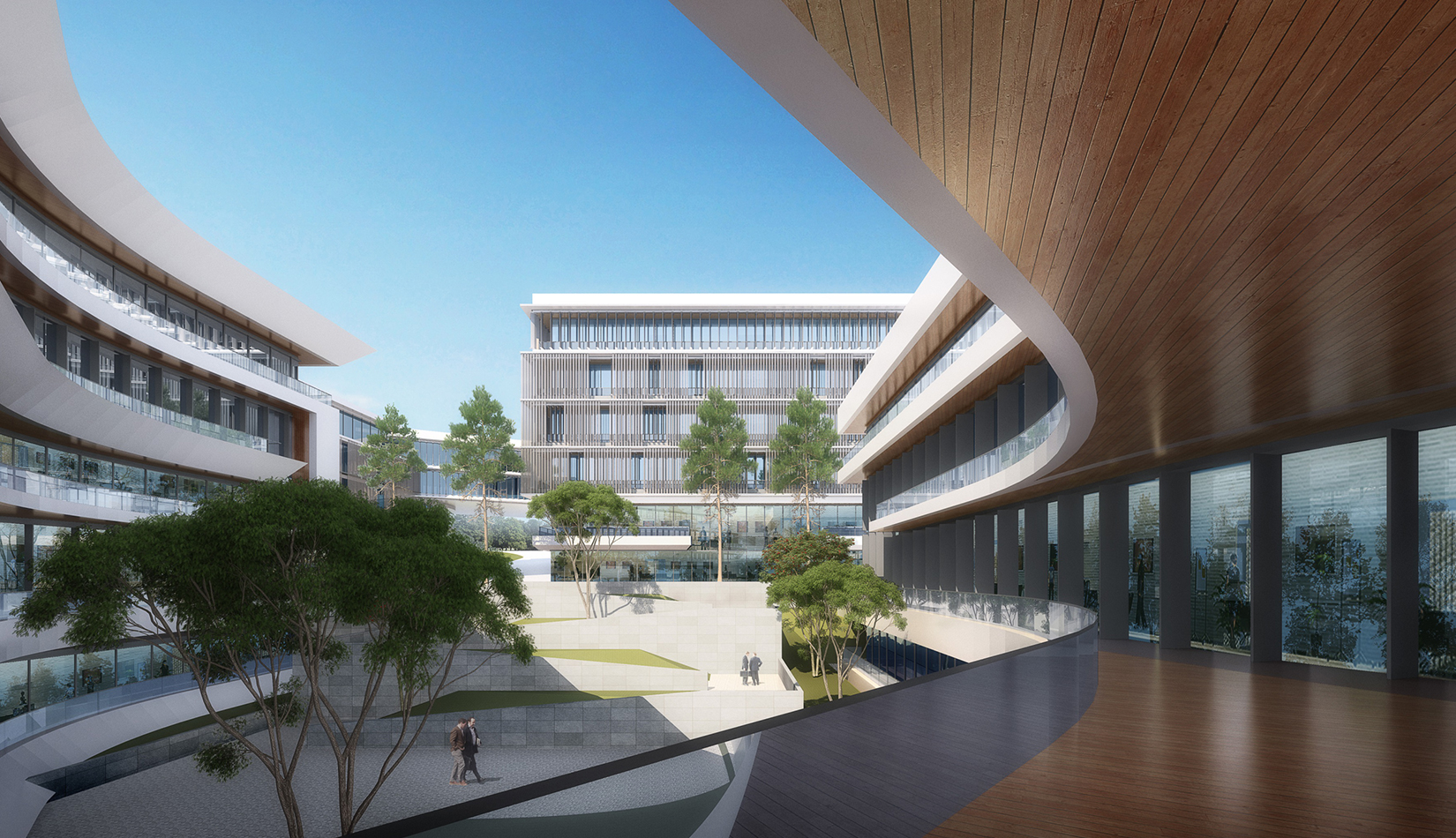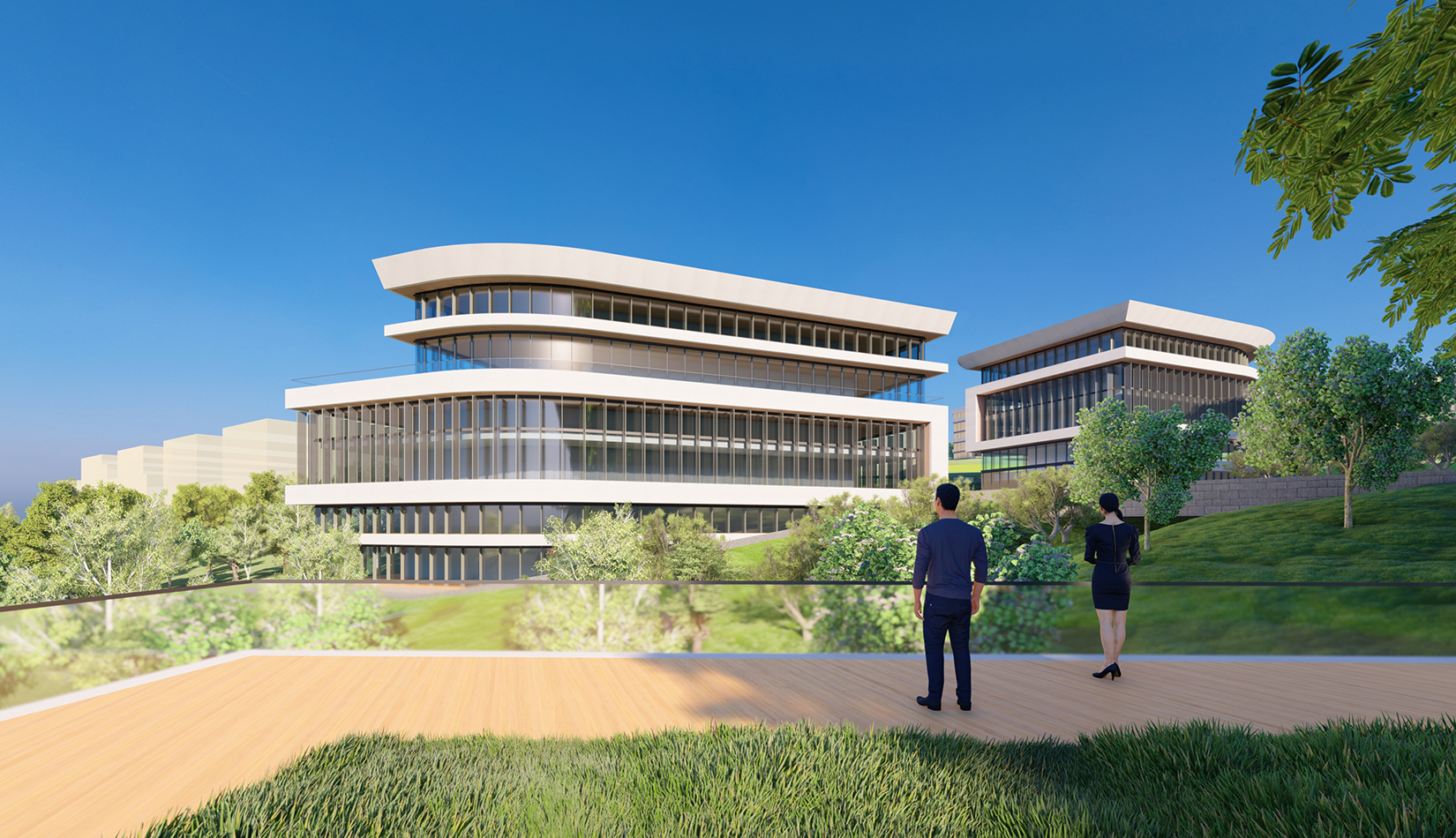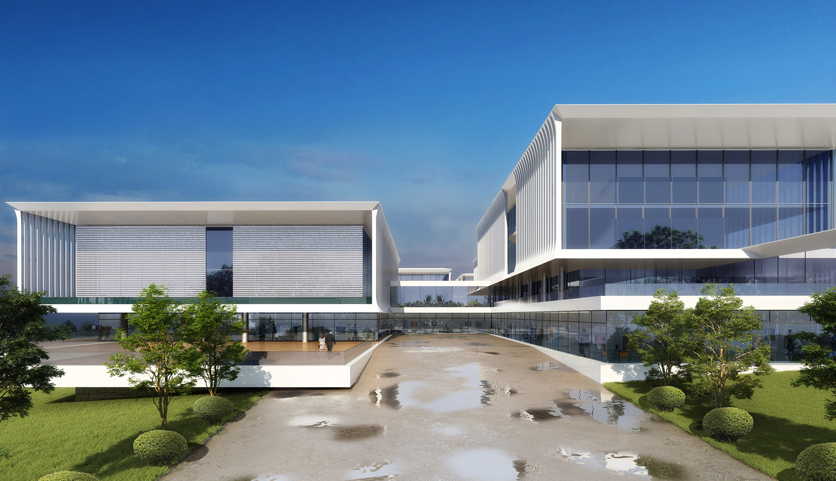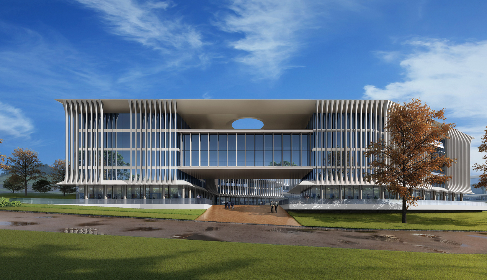 簡潔大氣的豎向橫向劃分,使MECS主樓充滿海洋氣息;白色流線型屋頂順應(yīng)地勢,自由舒展。流線型的體塊靠近海岸線,表達科研人員的探索精神,并且與地勢相結(jié)合。